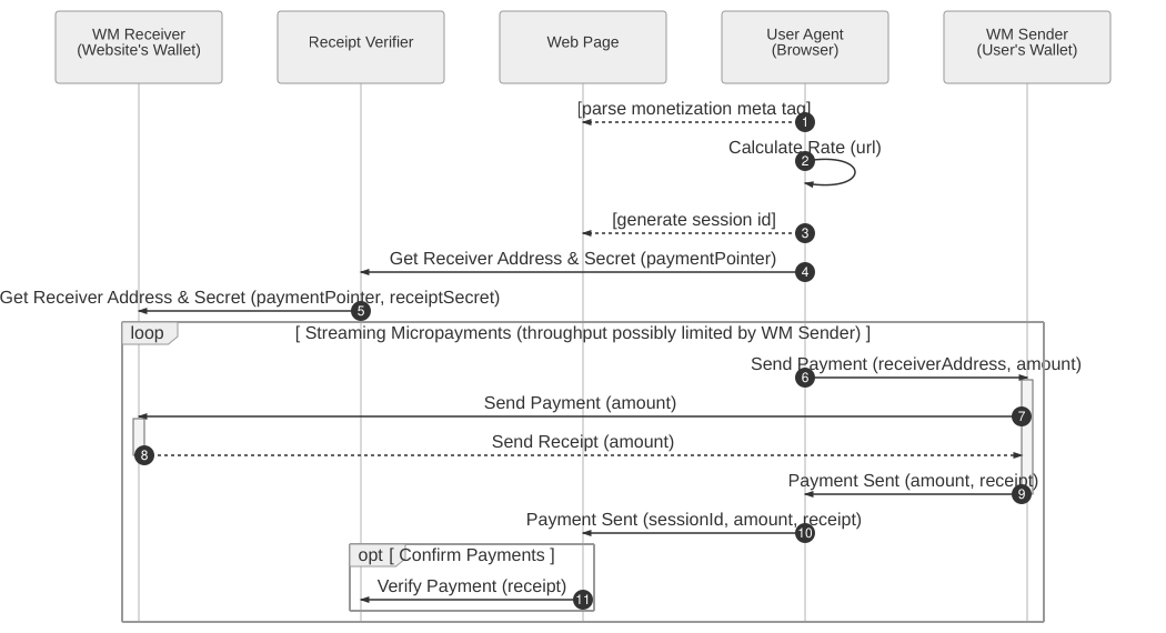 In short, the monetization meta-tag on the page is parsed by the browser, which initiates a session for a page visit and triggers the payment through the payment pointer.